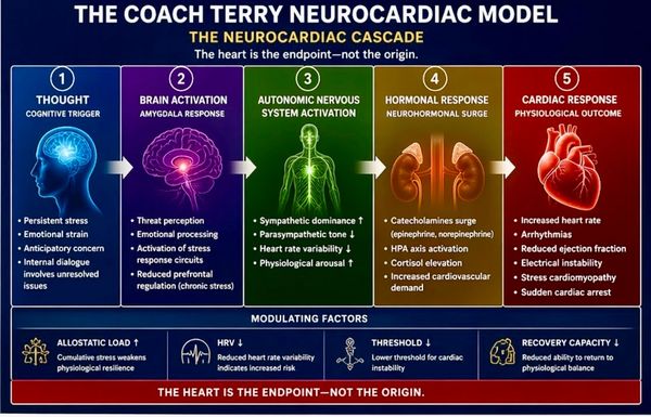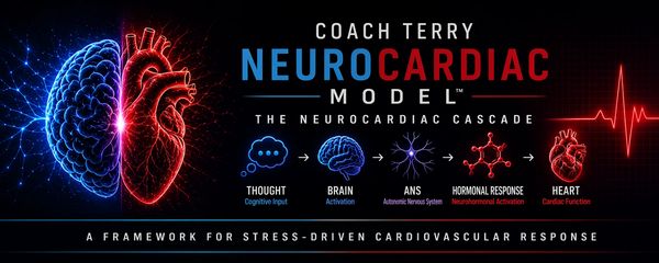 The Coach Terry Neurocardiac Model™ (Neurocardiac Cascade) is a structured framework that explains how cognitive stress translates into physiological response and cardiac impact.